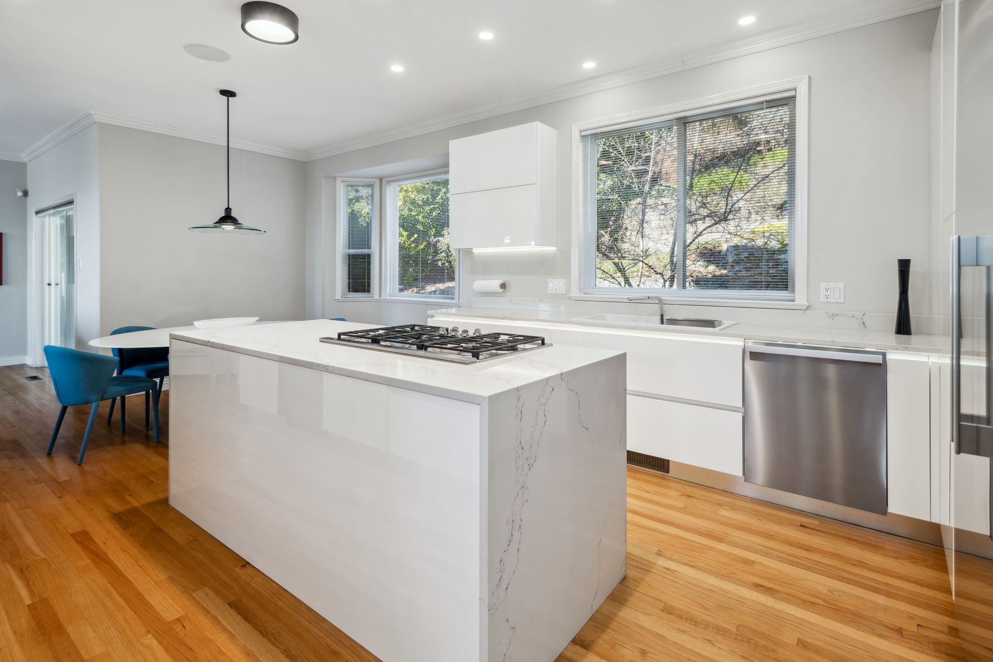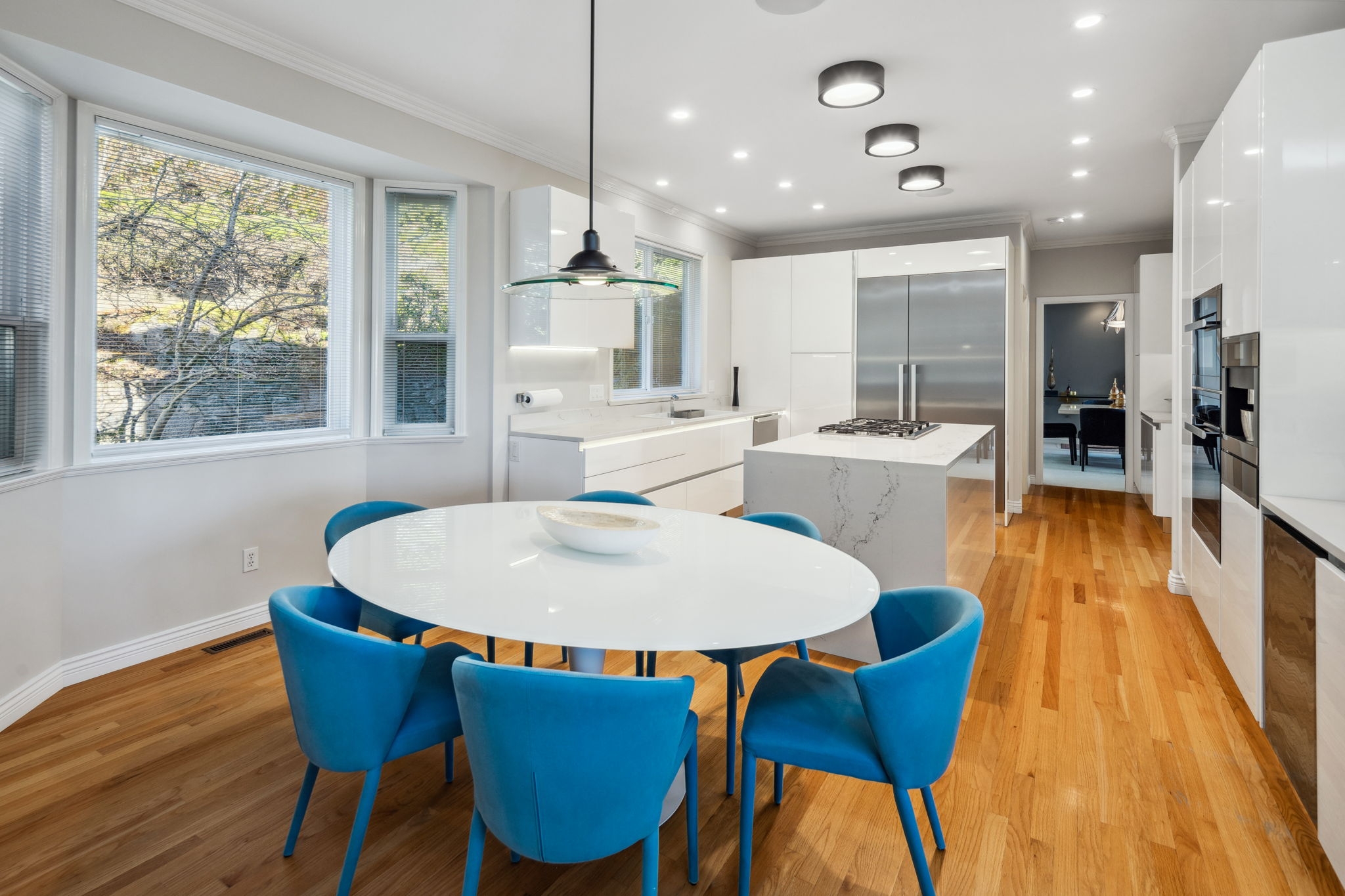 Inside, nearly 4,824 sq ft of beautifully finished living space unfolds across three thoughtfully designed levels. A grand vaulted entry with curved staircase sets a welcoming tone, while extensive oak hardwood flooring, detailed mouldings, and elegant coffered ceilings add warmth and craftsmanship throughout. The heart of the home is a fully renovated gourmet kitchen, featuring high-end stainless steel appliances, gas cooktop island, sleek cabinetry, and a bright adjoining eating area designed for family connection and effortless entertaining.